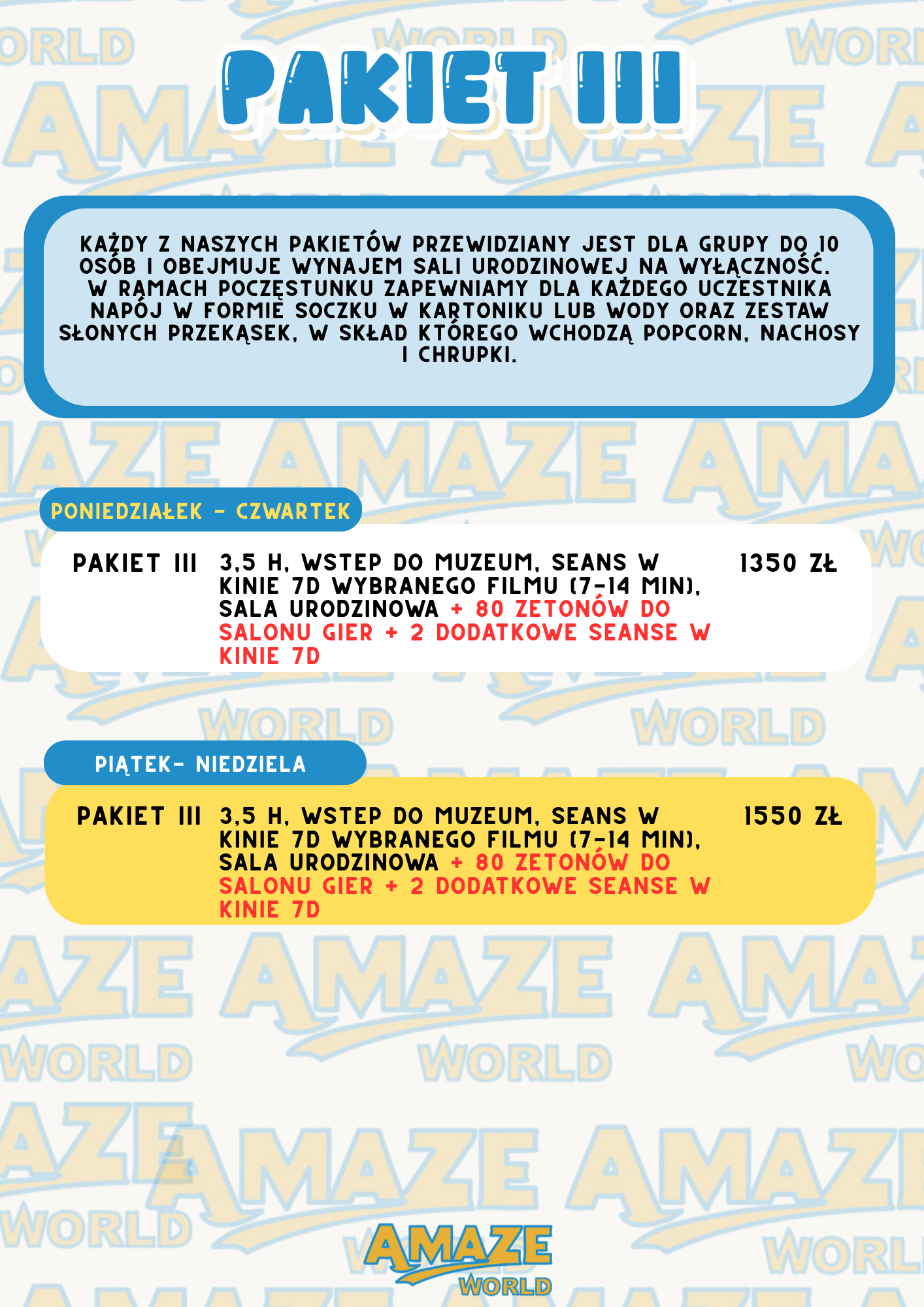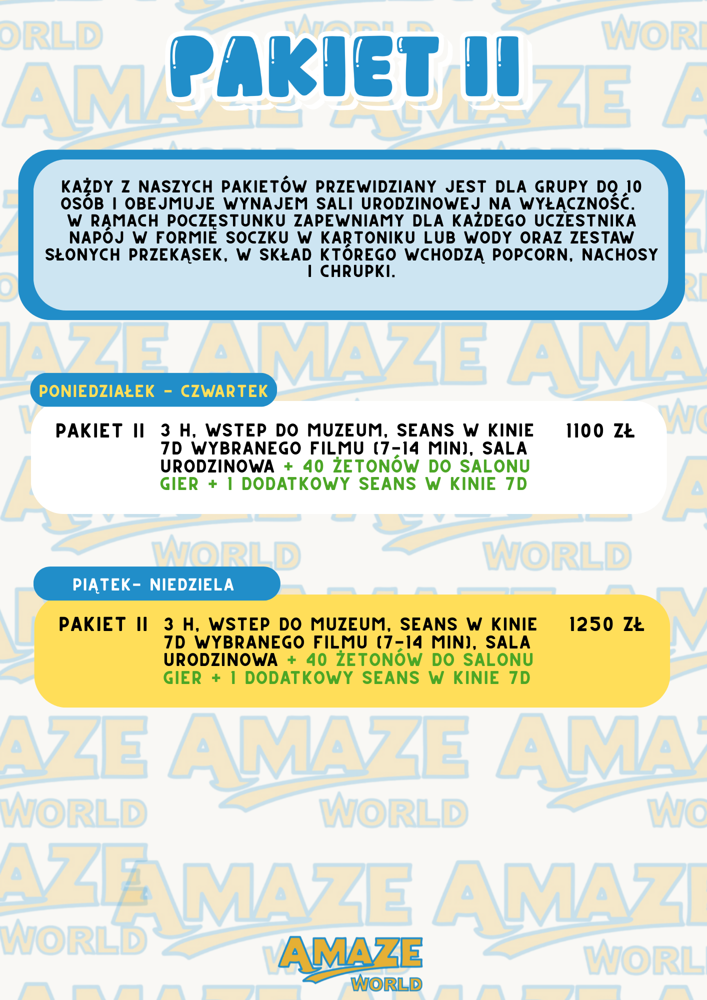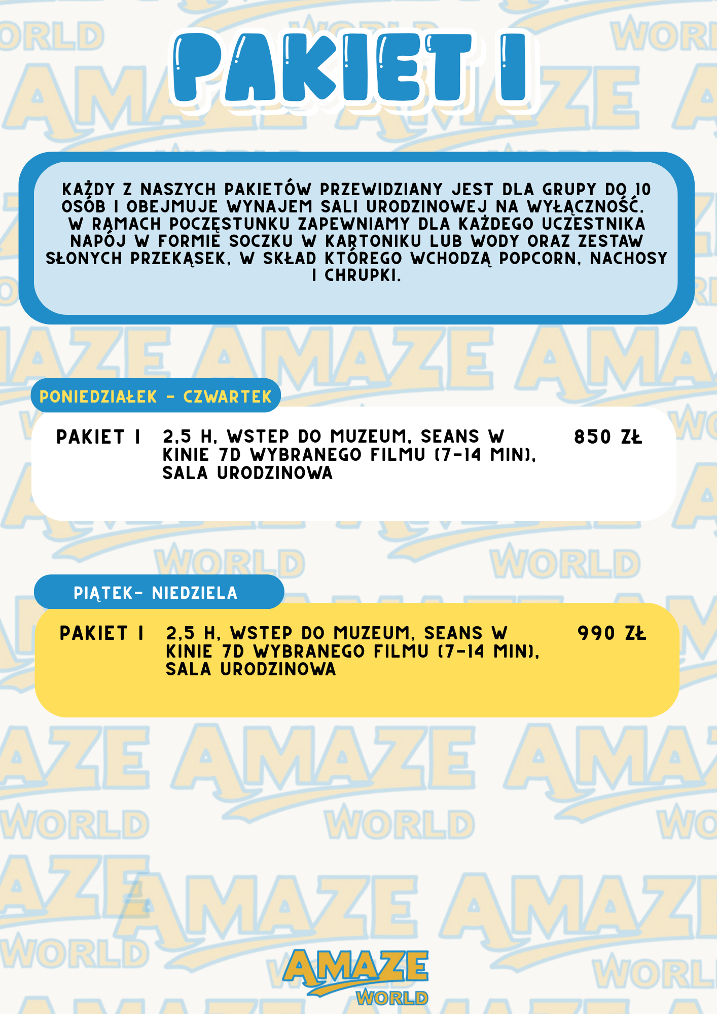 W przypadku urodzin organizowanych przez Amaze World dostępne są pakiety różniące się długością i zakresem atrakcji – od podstawowych atrakcji i seansu 7D po rozbudowane opcje z dodatkowymi grami i dłuższym czasem świętowania. To znacznie upraszcza decyzję i planowanie. Zobacz nasze pakiety: